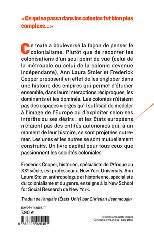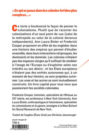 Ce texte a bouleversé la façon de penser le colonialisme. Plutôt que de raconter les colonisations d'un seul point de vue (celui de la métropole ou celui de la colonie devenue indépendante), Ann Laura Stoler et Frederick Cooper proposent en effet de les englober dans une histoire des empires qui permet d'étudier ensemble, dans leurs interactions réciproques, les dominants et les dominés. Les colonies n'étaient pas des espaces vierges qu'il suffisait de modeler à l'image de l'Europe ou d'exploiter selon ses intérêts ou ses désirs ; et les États européens n'étaient pas des entités autonomes qui, à un moment de leur histoire, se sont projetées outre-mer. Les unes et les autres se sont mutuellement construits. Un livre capital pour tous ceux que passionnent les sociétés coloniales.