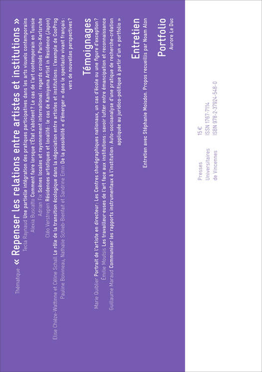 Ce numéro explore les relations entre artistes et institutions, en analysant les tensions entre aspirations artistiques et logiques institutionnelles, afin de mettre en lumière les rapports de pouvoir à l’œuvre.