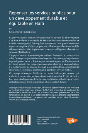 Cet ouvrage propose une analyse critique des défaillances structurelles de l’État haïtien dans la fourniture des biens publics, en mobilisant les cadres de l’économie politique des institutions et du développement territorial. Il explore les tensions entre logiques formelles et pratiques informelles, les dynamiques d’acteurs, les blocages institutionnels et les mécanismes de dé-légitimation qui entravent l’action publique. À partir d’une démarche an-crée dans les réalités locales, il formule des pistes de réforme orientées vers une gouvernance plus inclusive, transparente et efficace. Cette réflexion in-terdisciplinaire s’adresse aux chercheurs, décideurs et praticiens soucieux de repenser les politiques publiques en contexte de fragilité étatique.