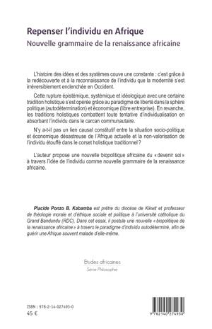 L'histoire des idées et des systèmes couve une constante : c'est grâce à la redécouverte et à la reconnaissance de l'individu que la modernité s'est irréversiblement enclenchée en Occident. Cette rupture épistémique, systémique et idéologique avec une certaine tradition holistique s'est opérée grâce au paradigme de liberté dans la sphère politique (autodétermination) et économique (libre entreprise). En revanche, les traditions holistiques combattent toute tentative d'individualisation en absorbant l'individu dans le carcan communautaire. N'y a-t-il pas un lien causal constitutif entre la situation socio-politique et économique désastreuse de l'Afrique actuelle et la non-valorisation de l'individu étouffé dans le corset holistique traditionnel ? L'auteur propose une nouvelle biopolitique africaine du « devenir soi » à travers l'idée de l'individu comme nouvelle grammaire de la renaissance africaine. Placide Ponzo B. Kabamba est prêtre du diocèse de Kikwit et professeur de théologie morale et d'éthique sociale et politique à l'université catholique du Grand Bandundu (RDC). Dans cet essai, il postule une nouvelle « biopolitique de la renaissance africaine » à travers le paradigme d'individu autodéterminé, afin de guérir une Afrique souvent malade d'elle-même.