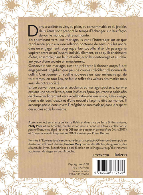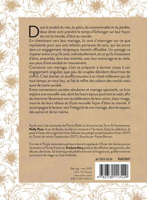 Dans la société du vite, du plein, du consommable et du jetable, deux êtres vont prendre le temps d'échanger sur leur façon de voir le monde, d'être au monde. En cheminant vers leur mariage, ils vont s'interroger sur ce que représente pour eux une relation durable, équitable, porteuse de sens, qui les ancre dans un engagement réciproque, bientôt officialisé. Entre conventions sociales séculaires et mariage spectacle des années 1990, ce livre explore une nouvelle voie dont les futurs époux pourront se saisir, afin de cheminer librement vers la célébration de leur union. Une célébration à leur image, nourrie de leurs idéaux et d'une nouvelle façon d'être au monde.
