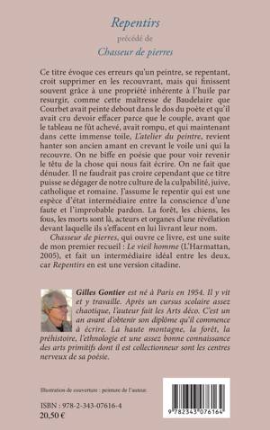 Ce titre évoque ces erreurs qu'un peintre, se représentant, croit supprimer en les recouvrant, mais qui finissent souvent grâce à une propriété inhérente à l'huile par resurgir, comme cette maîtresse de Baudelaire que Courbet avait peinte debout dans le dos du poète et qu'il avait cru devoir effacer... Ce recueil est la suite du premier recueil de Gilles Gontier Vieil homme et fait un intermédiaire idéal entre les deux, car Repentirs en est une version citadine.
