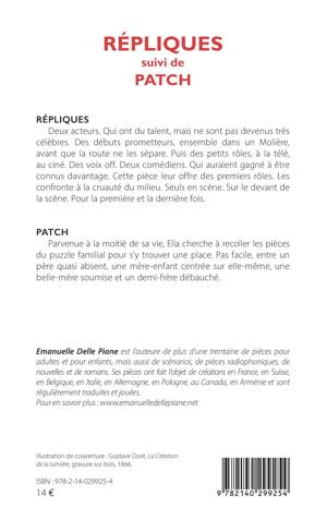 RÉPLIQUES Deux acteurs. Qui ont du talent, mais ne sont pas devenus très célèbres. Des débuts prometteurs, ensemble dans un Molière, avant que la route ne les sépare. Puis des petits rôles, à la télé, au ciné. Des voix off. Deux comédiens. Qui auraient gagné à être connus davantage. Cette pièce leur offre des premiers rôles. Les confronte à la cruauté du milieu. Seuls en scène. Sur le devant de la scène. Pour la première et la dernière fois. PATCH Parvenue à la moitié de sa vie, Ella cherche à recoller les pièces du puzzle familial pour s'y trouver une place. Pas facile, entre un père quasi absent, une mère-enfant centrée sur elle-même, une belle-mère soumise et un demi-frère débauché.