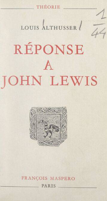Au printemps 72, le philosophe communiste anglais, John Lewis, consacre, dans la revue du Parti communiste britannique, Marxism Today, deux articles au « Cas Althusser ». Diagnostic : « dogmatisme aigu ». Pronostic : « le malade n’ira pas loin ». Le point d’attaque est l’humanisme. Pour John Lewis, pas de problème : la philosophie marxiste est humaniste. « C’est l’homme qui fait l’histoire ». L’homme fait l’histoire en « transcendant » l’histoire. « L’homme ne connaît que ce qu’il fait ». « La thèse d’Althusser sur la coupure épistémologique » est une « pure invention ». Marx a toujours été, du début à la fin, humaniste et hégélien. Croyant à l’Homme, à l’Aliénation, et à la Négation de la Négation (= transcendance). J’ai répondu à John Lewis dans un article publié par Marxism Today à l’automne 72. Voici la version française du texte anglais, corrigé, et sur certains points développé, — et une longue note politique, trop étendue pour figurer alors dans l’article. À l’idéalisme de John Lewis, j’oppose les thèses matérialistes du marxisme-léninisme sur l’histoire, la lutte des classes, et la philosophie. J’en tire des conclusions théoriques. À propos de la « coupure épistémologique », je maintiens ma thèse, mais je reprends mon « autocritique » de 67 : ma déviation théoriciste m’a bel et bien engagé, en 1963-65, dans une conception erronnée de la philosophie. J’en tire les premières conséquences : sur l’histoire de la pensée de Marx. Mais surtout, je pose la question : pourquoi ce débat sur l’humanisme ? pourquoi cette vague d’idéologie bourgeoise dans le marxisme ? Là où John Lewis se tait, je parle de politique. D’abord : le XXe Congrès, son explication pseudo-marxiste des « violations de la légalité socialiste » par le « culte de la personnalité ». Les résultats. Mais il faut remonter au-delà du XXe Congrès : à la longue lutte du Mouvement ouvrier pour rompre avec l’idéologie bourgeoise et occuper des positions prolétariennes. Or, le cœur de l’idéologie bourgeoise, c’est le couple économisme-humanisme. L’humanisme, quand il n’est pas un simple discours généreux, mais un système cohérent et durable, a toujours un envers : l’économisme. Même dans le Mouvement ouvrier. La preuve : la IIe Internationale. La lutte ne fait que continuer. Louis Althusser
