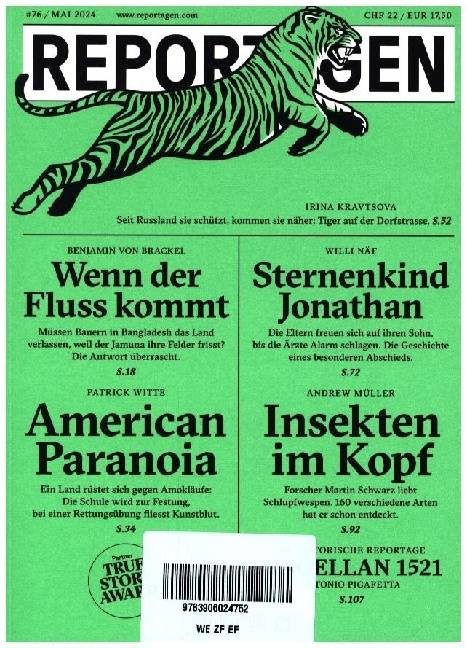 Grosse Reportagen im Taschenbuch. Herausragende Autor:innen berichten, was hinter den Kulissen des Weltgeschehens passiert.Die Geschichten:Wenn der Fluss kommtMerkwürdiges geschieht mit dem Jamuna, einem Fluss in Bangladesch. Er dehnt sich aus. Dabei verschlingt er Ackerflächen und reisst das Zuhause von Zehntausenden mit sich. In Zürich verfolgt ein Wissenschaftler anhand von Satellitendaten die Bewegungen der Menschen. Er versucht, eine Frage zu beantworten: Wann setzen als Folge des Klimawandels die grossen Migrationsbewegungen ein? Von Benjamin von BrackelAmerican ParanoiaEine Rettungsübung an einer High School im Bundesstaat New York, an der Kinder und Jugendliche mit geschminkten Schusswunden teilnehmen. Eine Messe in Las Vegas, auf der gepanzerte Tafeln, Roboterhunde und Gesichtserkennungssoftware angepriesen werden: US-Schulen rüsten sich mit immer grösserem Aufwand gegen Amokläufe. Trotzdem steigt die Zahl der Schusswaffenvorfälle. Von Patrick WitteTiger auf der DorfstrasseAls die Meteorologin Swetlana zur Arbeit geht, stösst sie an der Kreuzung auf einen Sibirischen Tiger. Weil Putin den Schutz der Wildkatze zur wichtigen Regierungsaufgabe erklärt hat, gleichzeitig aber dessen Lebensraum massiv zerstört wird, treffen im östlichsten Russland Mensch und Tiger immer öfter aufeinander. Die Folgen: Besorgte Zoologen, verängstigte Schulkinder und verspeiste Hunde. Von Irina KravtsovaSternenkind JonathanAnna-Julia und Micha bekommen ihr erstes Kind. Bei Untersuchungen wird klar, dass es Trisomie 18 hat, was in den meisten Fällen zum Tod im Mutterleib oder im ersten Lebensjahr führt. Dennoch entscheiden sich die Eltern, ihrem Kind gegen alle Wahrscheinlichkeiten ein Leben zu ermöglichen. Als es da ist, bleibt zunächst keine Zeit für Trauer. Die Tage mit Jonathan sind alles, was zählt. Von Willi Näf Insekten im KopfIn einem Altersheim im Norden Österreichs entdeckt ein Zivildienstleistender eine neue Schlupfwespenart. Der Finder ist der Sohn eines leidenschaftlichen Insektenforschers, der Spezies nach seinen Kindern benennt. Bei einem Hausbesuch erfährt unser Autor, dass die Insekten mehr Platz im Gefrierfach einnehmen als Tiefkühlkost, und dass Entomologen selbst eine bedrohte Art sind. Von Andrew MüllerMagellan, 1521Der portugiesische Seefahrer Ferdinand Magellan segelt im Auftrag der spanischen Krone nach Westen, um die beste Route zu den indonesischen Gewürzinseln zu finden. Auf den Philippinen tritt seine Mannschaft auf wie eine Weltmacht: Sie schüchtert mit Kanonenschüssen ein, tauscht Gold gegen weniger wertvolle Ware und tauft die Insulaner. Das kann für Magellan nicht lange gut gehen. Eine historische Reportage von Antonio Pigafetta