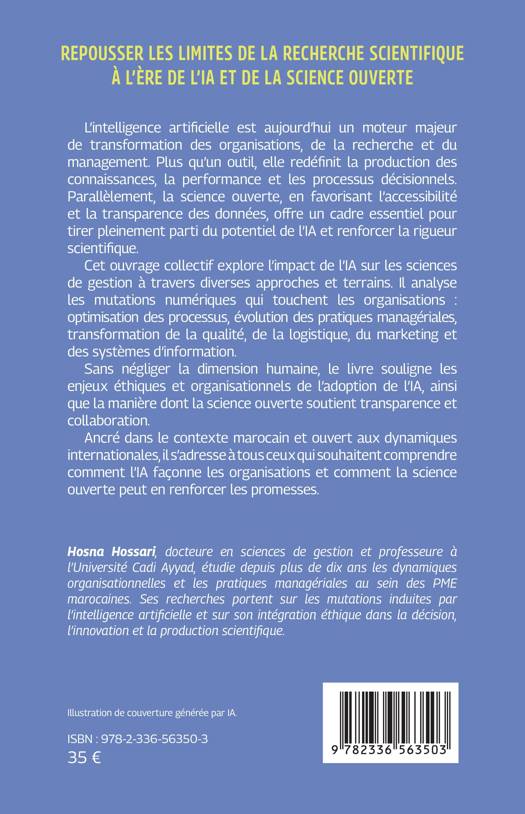 L'intelligence artificielle est aujourd'hui un moteur majeur de transformation des organisations, de la recherche et du management. Plus qu'un outil, elle redéfinit la production des connaissances, la performance et les processus décisionnels. Parallèlement, la science ouverte, en favorisant l'accessibilité et la transparence des données, offre un cadre essentiel pour tirer pleinement parti du potentiel de l'IA et renforcer la rigueur scientifique. Cet ouvrage collectif explore l'impact de l'IA sur les sciences de gestion à travers diverses approches et terrains. Il analyse les mutations numériques qui touchent les organisations optimisation des processus, évolution des pratiques managériales, transformation de la qualité, de la logistique, du marketing et des systèmes d'information. Sans négliger la dimension humaine, le livre souligne les enjeux éthiques et organisationnels de l'adoption de l'IA, ainsi que la manière dont la science ouverte soutient transparence et collaboration. Ancré dans le contexte marocain et ouvert aux dynamiques internationales, il s'adresse à tous ceux qui souhaitent comprendre comment l'IA façonne les organisations et comment la science ouverte peut en renforcer les promesses.