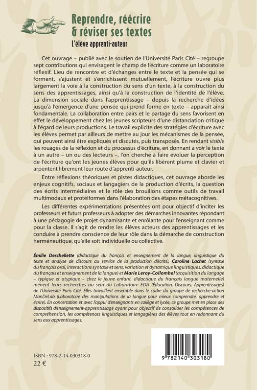 Cet ouvrage regroupe sept contributions qui envisagent le champ de l'écriture comme un laboratoire réflexif. Lieu de rencontre et d'échanges entre le texte et la pensée qui se forment, s'ajustent et s'enrichissent mutuellement, l'écriture ouvre plus largement la voie à la construction du sens d'un texte, à la construction du sens des apprentissages, ainsi qu'à la construction de l'identité de l'élève. La dimension sociale dans l'apprentissage apparaît ainsi fondamentale. La collaboration entre pairs et le partage du sens favorisent en effet le développement chez les jeunes scripteurs d'une distanciation critique à l'égard de leurs productions. Le travail explicite des stratégies d'écriture avec les élèves permet par ailleurs de mettre au jour les mécanismes de la pensée, qui peuvent ainsi être expliqués et discutés, puis transposés. En rendant visible les rouages de la réflexion et du processus d'écriture, en donnant à voir le texte à un autre, l'on cherche à faire évoluer la perception de l'écriture qu'ont les jeunes élèves pour qu'ils libèrent plume et clavier et arpentent librement leur route d'apprenti-auteur. Entre réflexions théoriques et pistes didactiques, cet ouvrage aborde les enjeux cognitifs, sociaux et langagiers de la production d'écrits, la question des écrits intermédiaires et le rôle des brouillons comme outils de travail multimodaux et protéiformes dans l'élaboration des étapes métacognitives.