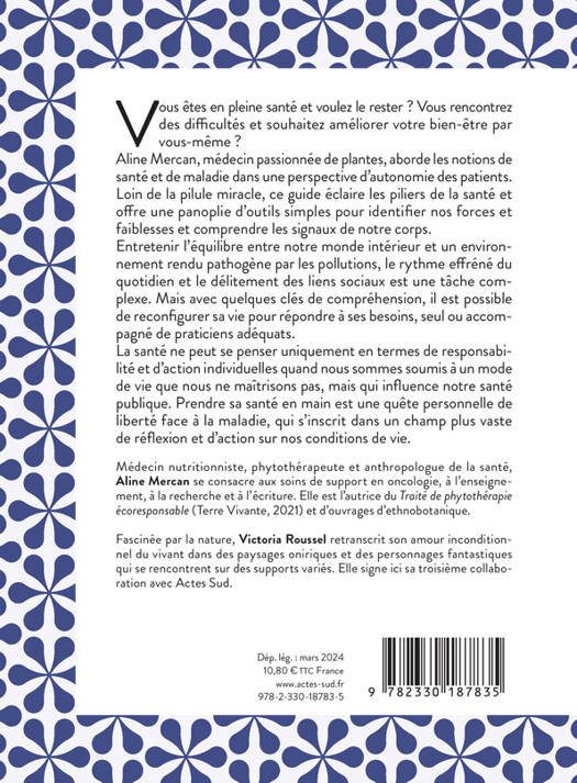 Vous êtes en pleine santé et voulez le rester ? Vous rencontrez des difficultés et souhaitez améliorer votre bien-être par vous- même ? Aline Mercan, médecin passionnée de plantes, aborde les notions de santé et de maladie dans une perspective d'autonomie des patients. Loin de la pilule miracle, ce guide éclaire les piliers de la santé et offre une panoplie d'outils simples pour identifier nos forces et faiblesses et comprendre les signaux de notre corps. Entretenir l'équilibre entre notre monde intérieur et un environnement rendu pathogène par les pollutions, le rythme effréné du quotidien et le délitement des liens sociaux est une tâche complexe. Mais avec quelques clés de compréhension, il est possible de reconfigurer sa vie pour répondre à ses besoins, seul ou accompagné de praticiens adéquats. La santé ne peut se penser uniquement en termes de responsabilité et d'action individuelles quand nous sommes soumis à un mode de vie que nous ne maîtrisons pas, mais qui influence notre santé publique. Prendre sa santé en main est une quête personnelle de liberté face à la maladie, qui s'inscrit dans un champ plus vaste de réflexion et d'action sur nos conditions de vie.