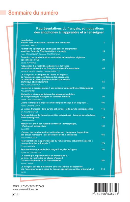 Jean-Marc DEFAYS - Motiver sans contraindre, séduire sans manipuler / Laura ABOU HAIDAR et Sandrine COURCHINOUX - Formations scientifiques et langues dans l'enseignement supérieur français. Représentations et usages / Souad BENABBES - Evolutions des représentations culturelles des étudiants algériens spécialisés en FLE / Karine BOUCHET, Nian LIU et Chantal PARPETTE - Préparation à la mobilité étudiante vers la Frane: motivations et besoins en français sur objectif universitaires / Afaf BOUDEBIA-BAALA - Le français et les langues de l'école en Algérie : de l'analyse des représentations des apprenants du primaire au développement d'une compétence plurilingue et pluriculturelle / Alice BURROWS - Interpréter la représentation ? Les enjeux d'un décentrement idéologique.