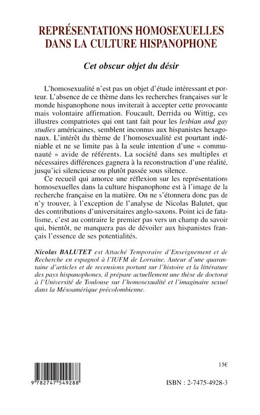 L'homosexualité n'est pas un objet d'étude intéressant et porteur. L'absence de ce thème dans les recherches françaises sur le monde hispanophone nous inviterait à accepter cette provocante mais volontaire affirmation. Foucault, Derrida ou Wittig, ces illustres compatriotes qui ont tant fait pour les lesbian and gay studies américaines, semblent inconnus aux hispanistes hexagonaux. L'intérêt du thème de l'homosexualité est pourtant indéniable et ne se limite pas à la seule intention d'une « communauté » avide de référents. La société dans ses multiples et nécessaires différences gagnera à la reconstruction d'une réalité, jusqu'ici silencieuse ou plutôt passée sous silence.