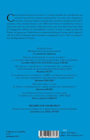 Ce nouveau numéro rassemble des contributions qui articulent la production de représentations d'une situation donnée et les différentes formes de mobilisation mises en uvre pour agir sur cette dernière. Elles parcourent ainsi un large éventail allant de l'engagement militaire de moudjahidines syriens à la mise en image du génocide Khmer, en passant par l'élaboration de catégories politiques d'action qu'il s'agisse de celle de LGBT ou du « oui » à la proposition d'indépendance de l'Ecosse.
