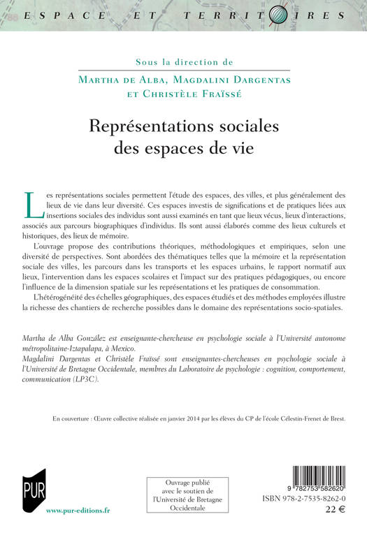 Les représentations sociales permettent l'étude des espaces, des villes, et plus généralement des lieux de vie dans leur diversité. Ces espaces investis de significations et de pratiques liées aux insertions sociales des individus sont aussi examinés en tant que lieux vécus, lieux d'interactions, associés aux parcours biographiques d'individus. Ils sont aussi élaborés comme des lieux culturels et historiques, des lieux de mémoire.