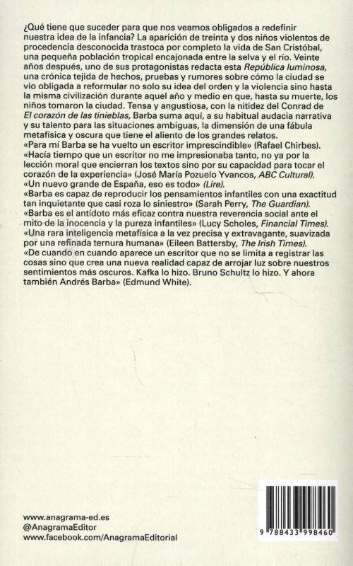 ¿Qué tiene que suceder para que nos veamos obligados a redefinir nuestra idea de la infancia? La aparición de treinta y dos niños violentos de procedencia desconocida trastoca por completo la vida de San Cristóbal, una pequeña ciudad tropical encajonada entre la selva y el río. Veinte años después, uno de sus protagonistas redacta esta República luminosa, una crónica tejida de hechos, pruebas y rumores sobre cómo la ciudad se vio obligada a reformular no solo su idea del orden y la violencia sino hasta la misma civilización durante aquel año y medio en que, hasta su muerte, los niños tomaron la ciudad. Tensa y angustiosa, con la nitidez del Conrad de El corazón de las tinieblas, Barba suma aquí, a su habitual audacia narrativa y su talento para las situaciones ambiguas, la dimensión de una fábula metafísica y oscura que tiene el aliento de los grandes relatos.