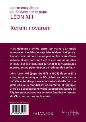Rerum novarum est le grand texte du pontificat de Léon XIII, lui-même pape à une époque charnière dans l'histoire de l'Europe et de l'Église catholique. Dans le contexte de l'industrialisation croissante du continent et des changements sociaux majeurs qu'elle induit, cette encyclique appelle à plus de justice dans la répartition des richesses et à un équilibre entre les différents acteurs économiques. Ce texte établit aussi la légitimité de l'Église à aborder des sujets temporels et techniques, et pose les fondements de la doctrine sociale de l'Église catholique. Cette édition est enrichie d'une présentation de Philippe d'Iribarne, sociologue et économiste, ancien directeur de recherche au CNRS, auteur notamment d'Au-delà des fractures chrétiennes (Salvator, 2024).