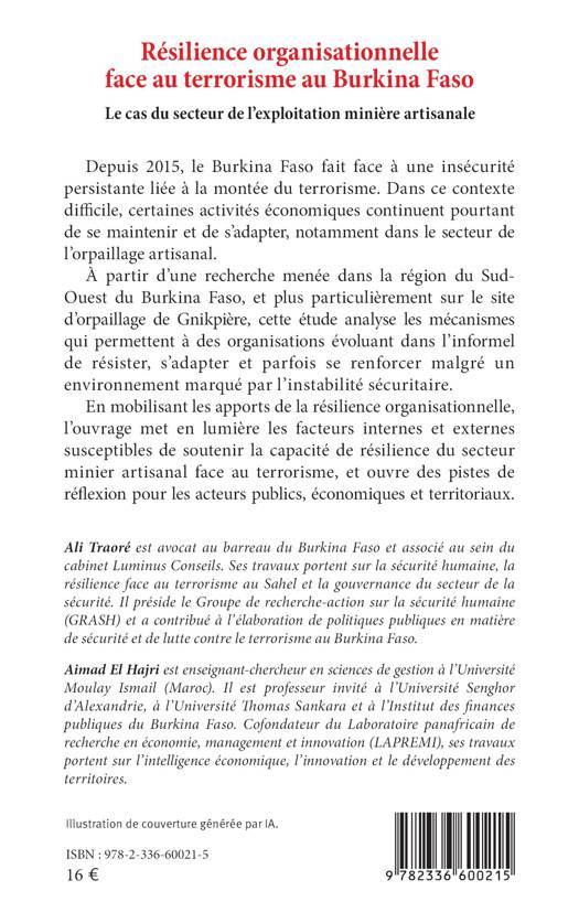 Depuis 2015, le Burkina Faso fait face à une insécurité persistante liée à la montée du terrorisme. Dans ce contexte difficile, certaines activités économiques continuent pourtant de se maintenir et de s'adapter, notamment dans le secteur de l'orpaillage artisanal. À partir d'une recherche menée dans la région du Sud-Ouest du Burkina Faso, et plus particulièrement sur le site d'orpaillage de Gnikpière, cette étude analyse les mécanismes qui permettent à des organisations évoluant dans l'informel de résister, s'adapter et parfois se renforcer malgré un environnement marqué par l'instabilité sécuritaire. En mobilisant les apports de la résilience organisationnelle, l'ouvrage met en lumière les facteurs internes et externes susceptibles de soutenir la capacité de résilience du secteur minier artisanal face au terrorisme, et ouvre des pistes de réflexion pour les acteurs publics, économiques et territoriaux.