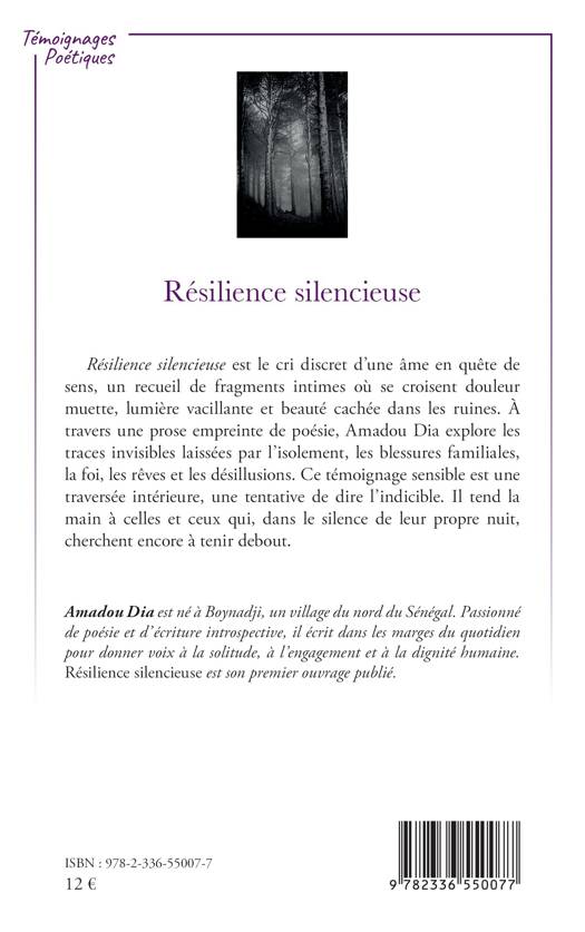 Résilience silencieuse est le cri discret d'une âme en quête de sens, un recueil de fragments intimes où se croisent douleur muette, lumière vacillante et beauté cachée dans les ruines. À travers une prose empreinte de poésie, Amadou Dia explore les traces invisibles laissées par l'isolement, les blessures familiales, la foi, les rêves et les désillusions. Ce témoignage sensible est une traversée intérieure, une tentative de dire l'indicible. Il tend la main à celles et ceux qui, dans le silence de leur propre nuit, cherchent encore à tenir debout.