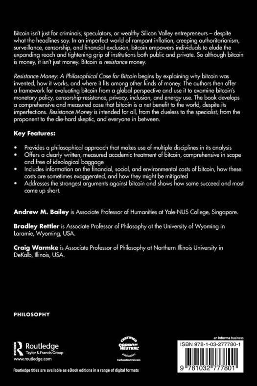 The book develops a comprehensive and measured case that bitcoin is a net benefit to the world, despite its imperfections. Resistance Money is intended for all, from the clueless to the specialist, from the proponent to the die-hard skeptic, and everyone in between.