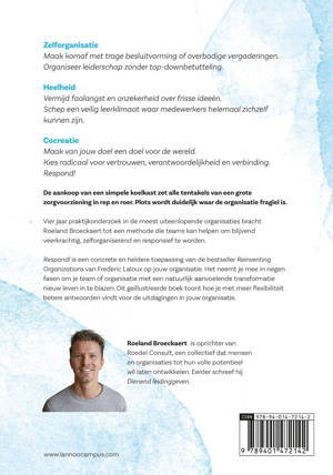 Zelforganisatie Maak komaf met trage besluitvorming of overbodige vergaderingen. Organiseer leiderschap zonder top-downbetutteling. Heelheid Vermijd faalangst en onzekerheid over frisse ideeën. Schep een veilig leerklimaat waar medewerkers helemaal zichzelf kunnen zijn. Cocreatie Maak van jouw doel een doel voor de wereld. Kies radicaal voor vertrouwen, verantwoordelijkheid en verbinding. Respond! De aankoop van een simpele koelkast zet alle tentakels van een grote zorgvoorziening in rep en roer. Plots wordt duidelijk waar de organisatie fragiel is. Vier jaar praktijkonderzoek in de meest uiteenlopende organisaties bracht Roeland Broeckaert tot een methode die teams kan helpen om blijvend veerkrachtig, zelforganiserend en responsief te worden. Respond! is een concrete en heldere toepassing van de bestseller Reinventing Organizations van Frederic Laloux op jouw organisatie. Het neemt je mee in negen fasen om je team of organisatie met een natuurlijk aanvoelende transformatie nieuw leven in te blazen. Dit geïllustreerde boek toont hoe je met meer flexibiliteit betere antwoorden vindt voor de uitdagingen in jouw organisatie.