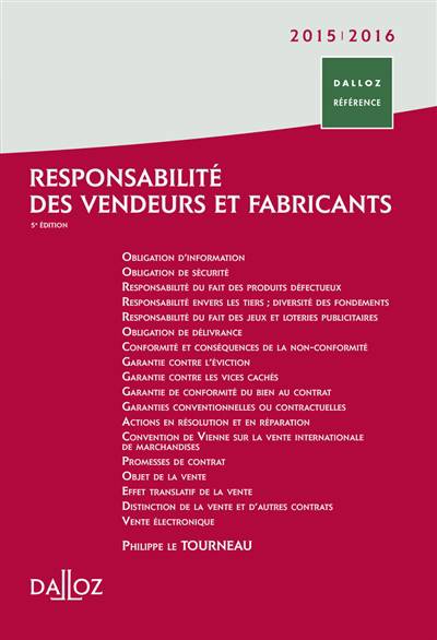 Le régime de la responsabilité des vendeurs et fabricants a connu des évolutions émanant tant de la jurisprudence que des pouvoirs publics, avec notamment la responsabilité du fait des produits défectueux (loi du 11 mai 1998, modifiée par les lois du 9 décembre 2004 et du 5 avril 2006), la garantie de la conformité du bien au contrat due par le vendeur au consommateur (ordonnance du 17 février 2005), et la loi pour la confiance dans l'économie numérique (loi du 21 juin 2004). Cette nouvelle édition intègre notamment la loi du 23 juillet 2010 qui est venue renforcer l'information du consommateur. Un titre préliminaire expose des généralités sur la vente (son effet translatif, son objet qui soulève des difficultés, la distinction avec d'autres contrats). La responsabilité des vendeurs et fabricants est présentée à revers, en étudiant les obligations de ces derniers, au cours de deux titres. En premier lieu sont abordées les obligations générales, qui ne sont pas propres à la vente, mais découlent du Droit commun des contrats (tout en pouvant jouer envers un vendeur ou un fabricant), tant à l'égard de l'acheteur que des tiers (dont la responsabilité du fait des produits défectueux, longuement analysée). Ensuite, les obligations qu'il est possible de qualifier de spéciales, en ce sens qu'elles sont spécifiques au Droit de la vente : obligation de délivrance conforme ; obligation de garantie (contre l'éviction, contre les vices cachés, et la garantie de la conformité du bien au contrat due par le vendeur au consommateur).