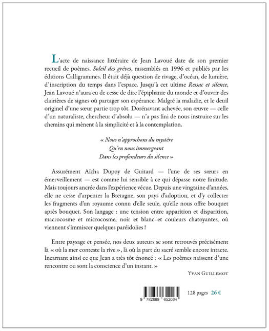 « Ressac et silence », réalisé par la photographe Aïcha Dupoy de Guitard et le poète Jean Lavoué, est un livre qui mêle images et textes dans une même méditation autour de la côte sauvage en Bretagne. Les photographies dialoguent avec une écriture de courts poèmes méditatifs de sept à dix vers pour explorer le lien entre le rivage et l'océan. Le motif du ressac — ce mouvement répétitif des vagues — devient une image de l'inscription du temps dans l'espace, tandis que le silence ouvre à la contemplation et l’écoute. L’ensemble compose une œuvre sensible, où se croisent les œuvres d’un royaume secret — des roches et des falaises comme sculptées par la marée et le vent —, cherchant à saisir la part du sacré « là où la mer conteste la rive ».