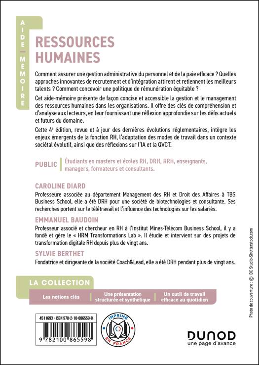 Comment assurer une gestion administrative du personnel et de la paie efficace ? Quelles approches innovantes de recrutement et d’intégration attirent et retiennent les meilleurs talents ? Comment concevoir une politique de rémunération équitable ? Cet aide-mémoire présente de façon concise et accessible la gestion et le management des ressources humaines dans les organisations. Il offre des clés de compréhension et d’analyse aux lecteurs, en leur fournissant une réflexion approfondie sur les défis actuels et futurs du domaine. Cette 4eédition, revue et à jour des dernières évolutions réglementaires, intègre les enjeux émergents de la fonction RH, l’adaptation des modes de travail dans un contexte sociétal évolutif, ainsi que des réflexions sur l’IA et la QVCT.