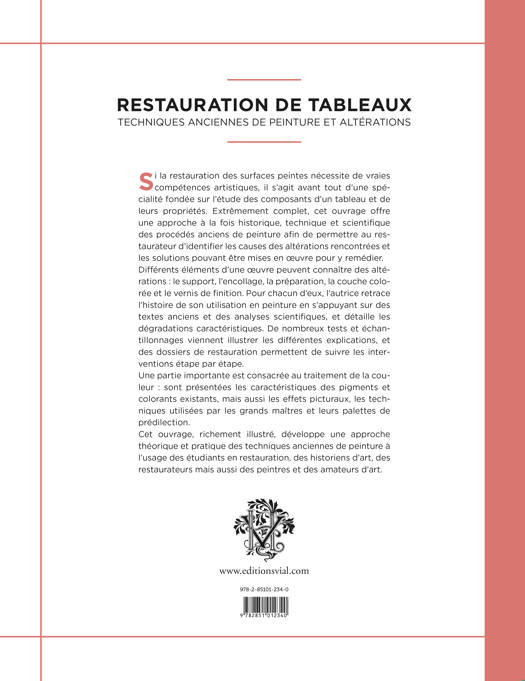 Si la restauration des surfaces peintes nécessite de vraies compétences artistiques, il s'agit avant tout d'une spécialité fondée sur l'étude des composants d'un tableau et de leurs propriétés. Extrêmement complet, cet ouvrage offre une approche à la fois historique, technique et scientifique des procédés anciens de peinture afin de permettre au restaurateur d'identifier les causes des altérations rencontrées et les solutions pouvant être mises en oeuvre pour y remédier. Différents éléments d'une oeuvre peuvent connaître des altérations : le support, l'encollage, la préparation, la couche colorée et le vernis de finition. Pour chacun d'eux, l'autrice retrace l'histoire de son utilisation en peinture en s'appuyant sur des textes anciens et des analyses scientifiques, et détaille les dégradations caractéristiques. De nombreux tests et échantillonnages viennent illustrer les différentes explications, et des dossiers de restauration permettent de suivre les interventions étape par étape.
