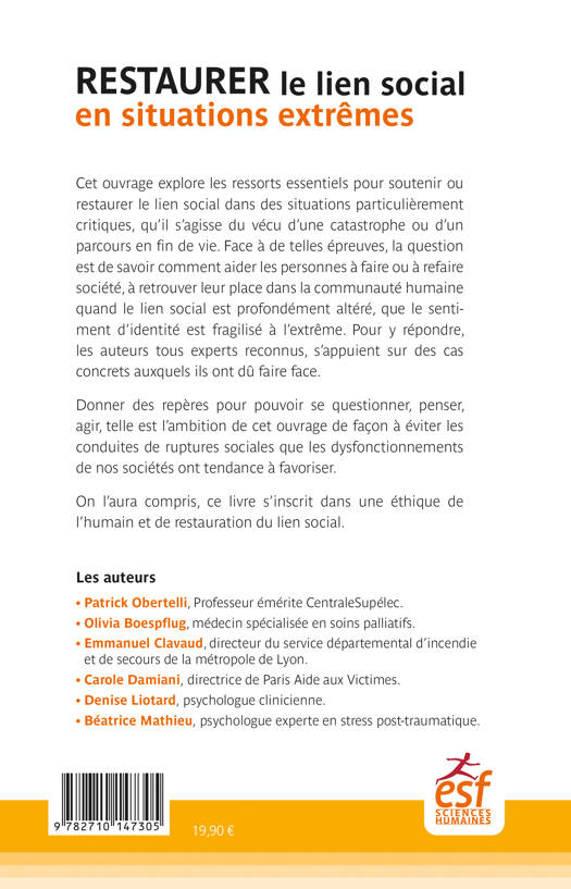 Cet ouvrage explore les ressorts essentiels pour soutenir ou restaurer le lien social dans des situations particulièrement critiques, qu’il s’agisse du vécu d’une catastrophe ou d’un parcours en fin de vie. Face à de telles épreuves, la question est de savoir comment aider les personnes à faire ou à refaire société, à retrouver leur place dans la communauté humaine quand le lien social est profondément altéré, que le sentiment d’identité est fragilisé à l’extrême. Pour y répondre, les auteurs tous experts reconnus, s’appuient sur des cas concrets auxquels ils ont dû faire face.
