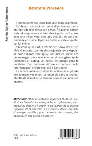 Florence n’est pas un nom de ville, mais un prénom. Le Retour annoncé est celui d’un homme qui a entrepris de revenir sur son passé. À savoir la liaison forte et surprenante à bien des égards qu’il a eue avec une nièce, vingt-cinq ans plus tôt, et qui s’est terminée en drame. L’histoire qu’il revit, à travers ses souvenirs et ses films d’amateur, tournés alors et jamais revus depuis, se passe durant l’été 1964. Le roman commence dans la lumineuse euphorie des grandes vacances, se poursuit dans la chaleur étouffante d’août et se termine sous le ciel noir des orages.