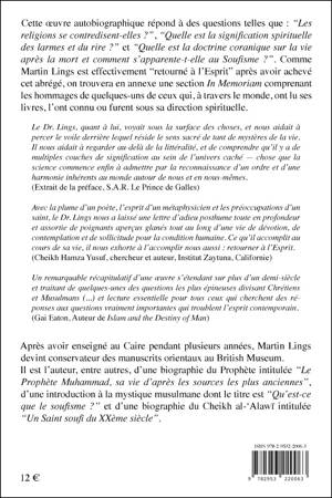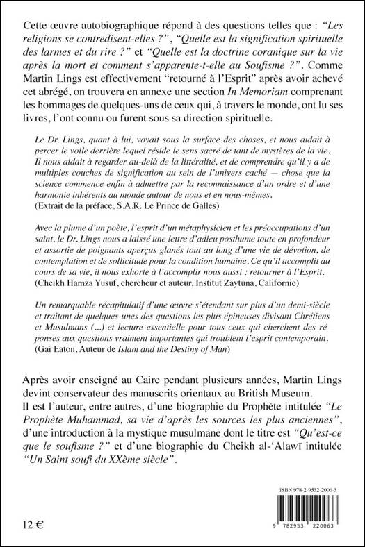 Cette œuvre autobiographique répond à des questions telles que : “Les religions se contredisent-elles ?”, “Quelle est la signification spirituelle des larmes et du rire ?” et “Quelle est la doctrine coranique sur la vie après la mort et comment s'apparente-t-elle au Soufisme ?”. Comme Martin Lings est effectivement "retourné à l'Esprit" après avoir achevé cet abrégé, on trouvera en annexe une section In Memoriam comprenant les hommages de quelques-uns de ceux qui, à travers le monde, ont lu ses livres, l'ont connu ou furent sous sa direction spirituelle. « Le Dr. Lings, quant à lui, voyait sous la surface des choses, et nous aidait à percer le voile derrière lequel réside le sens sacré de tant de mystères de la vie. Il nous aidait à regarder au-delà de la littéralité, et de comprendre qu'il y a de multiples couches de signification au sein de l'univers caché chose que la science commence enfin à admettre par la reconnaissance d'un ordre et d'une harmonie inhérents au monde autour de nous et en nous-mêmes ». Extrait de la préface de S.A.R. Le Prince de Galles.
