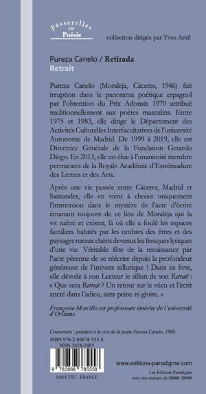 Après une vie passée entre Cáceres, Madrid et Santander, elle en vient à choisir uniquement l’immersion dans le mystère de l’acte d’écrire émanant toujours de ce lieu de Moraleja qui la vit naître et exister, là où elle a foulé les espaces familiers habités par les ombres des êtres et des paysages ruraux chéris devenus les fresques lyriques d’une vie. Véritable fête de la renaissance par l’acte pérenne de se réécrire depuis la profondeur généreuse de l’univers tellurique ! Dans ce livre, elle dévoile à son Lecteur le sillon de son Retrait : « Que sera Retrait ? Un retour sur le vécu et l’écrit ancré dans l’adieu, sans peine ni gloire. »