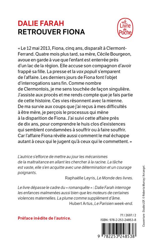 « Le 12 mai 2013, Fiona, cinq ans, disparaît à Clermont-Ferrand. Quatre mois plus tard, sa mère, Cécile Bourgeon, avoue en garde à vue que l’enfant est enterrée près d’un lac de la région. Elle accuse son compagnon d’avoir frappé sa fille. La presse et la vox populi s’emparent de l’affaire. Les derniers jours de Fiona font l’objet d’interrogations sans fin. Comme nombre de Clermontois, je me sens touchée de façon singulière. J’assiste aux procès et me rends compte que je fais partie de cette histoire. Ces vies résonnent avec la mienne. De ma survie aux coups que j’ai reçus à mes difficultés à être mère, je perçois le processus qui mène à la disparition de Fiona. J’ai suivi cette affaire près de dix ans, pour comprendre le huis clos d’existences qui semblent condamnées à souffrir ou à faire souffrir. Car l’affaire Fiona révèle aussi comment le mal échappe autant à ceux qui le jugent qu’à ceux qui le commettent. »