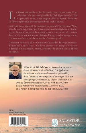 La liberté spirituelle est le vibrato du chant de notre vie. Pour le chrétien, elle est cette parcelle de Ciel déposée en lui. Elle lui apprend à voler de ses propres ailes. À penser librement. La liberté spirituelle est notre plus beau chef-d'oeuvre. Pourtant, notre capacité de jugement est aujourd'hui en péril. Nous nous laissons hypnotiser par les écrans de nos smartphones. Et nous vivons la nuque baissée à la maison, dans la rue, au travail et même dans un tête-à-tête amoureux ! Saturés d'images et de messages, nous courons tout le temps à la recherche d'un sens perdu. Comment relever la tête ? Comment s'accorder de longs moments d'intériorité libératrice ? Ce livre propose un temps de retraite à domicile pour, modestement, retrouver le chemin de sa liberté intérieure. AUTEUR Né en 1956, Michel Cool est journaliste de presse écrite, de radio et de télévision. Il a également été éditeur. Animateur de retraites spirituelles, il est l'auteur d'une vingtaine d'ouvrages, dont son témoignage Conversion au silence (Salvator 2011 ; Prix de littérature religieuse 2012 ; rééd. poche 2021), l'essai Retrouver l'enthousiasme (Salvator, 2021) et le roman L'échappée belle du pape (Quasar, 2023).