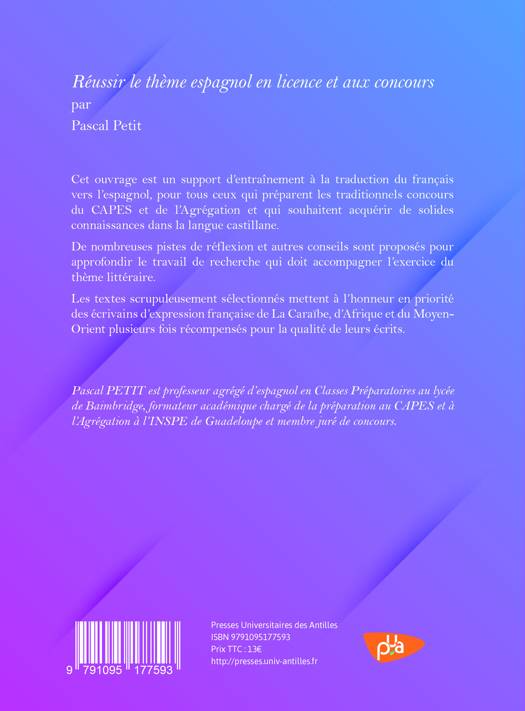 Cet ouvrage est un support d’entraînement à la traduction du français vers l’espagnol, pour tous ceux qui préparent les traditionnels concours du CAPES et de l’Agrégation et qui souhaitent acquérir de solides connaissances dans la langue castillane.