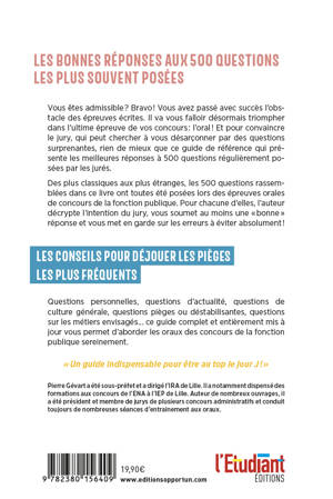 Vous êtes admissible ? Bravo ! Vous avez passé avec succès l'obstacle des épreuves écrites. Il va vous falloir désormais triompher dans l'ultime épreuve de vos concours : l'oral ! Et pour convaincre le jury, qui peut chercher à vous désarçonner par des questions surprenantes, rien de mieux que ce guide de référence qui présente les meilleures réponses à 500 questions régulièrement posées par les jurés.