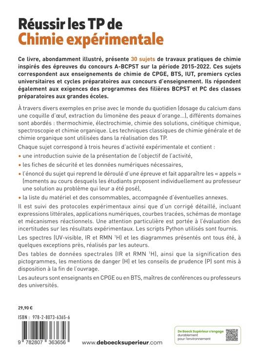 Ce livre, abondamment illustré, présente 30 sujets de travaux pratiques de chimie inspirés des épreuves du concours A-BCPST sur la période 2015-2022. Ces sujets correspondent aux enseignements de chimie de CPGE, BTS, IUT, premiers cycles universitaires et cycles préparatoires aux concours d’enseignement. Ils répondent également aux exigences des programmes des filières BCPST et PC des classes préparatoires aux grandes écoles.
