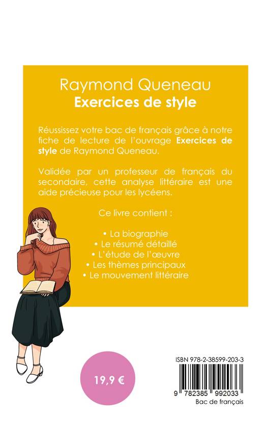 Réussissez votre bac de français 2026 grâce à notre fiche de lecture du livre Exercices de style de Raymond Queneau ! Validée par un professeur de français du secondaire, cette analyse littéraire est une aide précieuse pour tous les lycéens. Grâce à notre travail éditorial, les points suivants n'auront plus aucun secret pour vous : la biographie de l'écrivain, le résumé du livre, l'étude de l'oeuvre, l'analyse des thèmes principaux à connaître et le mouvement littéraire auquel est rattaché l'auteur.