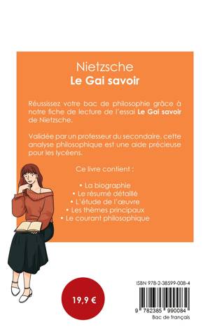 Réussissez votre bac de philosophie 2025 grâce à notre fiche de lecture de l'essai Le Gai savoir de Nietzsche ! Validée par un professeur du secondaire, cette analyse philosophique est une aide précieuse pour tous les lycéens. Grâce à notre travail éditorial, les points suivants n'auront plus aucun secret pour vous : la biographie du philosophe, le résumé du livre, l'étude de l'oeuvre, l'analyse des thèmes principaux à connaître et le courant philosophique auquel est rattaché l'auteur.