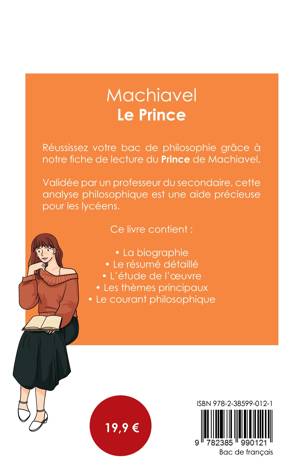 Réussissez votre bac de philosophie 2025 grâce à notre fiche de lecture de l'essai Le Prince de Machiavel ! Validée par un professeur du secondaire, cette analyse philosophique est une aide précieuse pour tous les lycéens. Grâce à notre travail éditorial, les points suivants n'auront plus aucun secret pour vous : la biographie du philosophe, le résumé du livre, l'étude de l'oeuvre, l'analyse des thèmes principaux à connaître et le courant philosophique auquel est rattaché l'auteur.