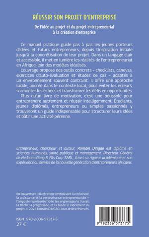 Ce manuel pratique guide pas à pas les jeunes porteurs d'idées et futurs entrepreneurs, depuis l'inspiration initiale jusqu'à la concrétisation de leur projet. Dans un langage clair et accessible, il met en lumière les réalités de l'entrepreneuriat en Afrique, loin des modèles idéalisés. L'ouvrage propose des outils concrets - checklists, canevas, exercices d'auto-évaluation et études de cas - adaptés à un environnement souvent contraint. Il off re une approche lucide, ancrée dans le contexte local, pour éviter les erreurs, surmonter les échecs et transformer les défi s en opportunités. Plus qu'un livre de motivation, c'est une boussole pour entreprendre autrement et réussir intelligemment. Étudiants, jeunes diplômés, entrepreneurs ou simples passionnés y trouveront un guide indispensable pour structurer leurs idées et bâtir une activité pérenne.
