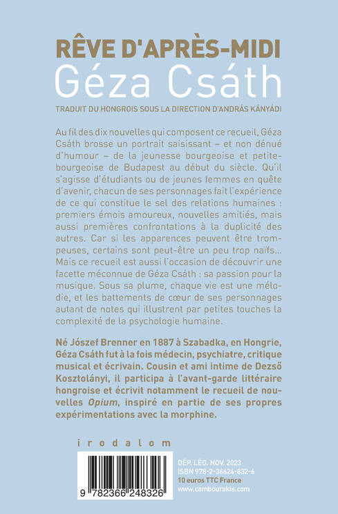 Au fil des dix nouvelles qui composent ce recueil, Géza Csáth brosse un portrait saisissant - et non dénué d'humour - de la jeunesse bourgeoise et petite-bourgeoise de Budapest au début du siècle. Qu'il s'agisse d'étudiants ou de jeunes femmes en quête d'avenir, chacun de ses personnages fait l'expérience de ce qui constitue le sel des relations humaines : premiers émois amoureux, nouvelles amitiés, mais aussi premières confrontations à la duplicité des autres. Car si les apparences peuvent être trompeuses, certains sont peut-être un peu trop naïfs... Mais ce recueil est aussi l'occasion de découvrir une facette méconnue de Géza Csáth : sa passion pour la musique. Sous sa plume, chaque vie est une mélodie, et les battements de coeur de ses personnages autant de notes qui illustrent par petites touches la complexité de la psychologie humaine.