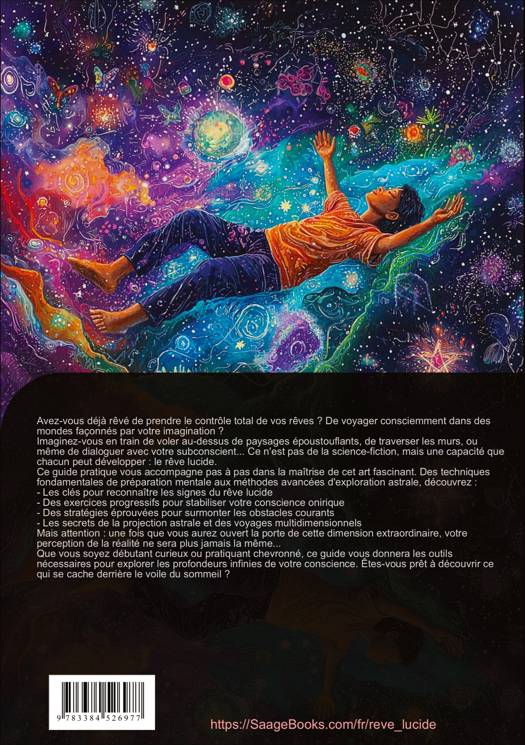Découvrez un guide pratique approfondi sur le rêve lucide, conçu pour vous accompagner dans la maîtrise de vos expériences oniriques.Ce livre sur les rêves lucides aborde de manière structurée les aspects essentiels pour apprendre le rêve lucide :- Les fondamentaux du rêve lucide et la compréhension des différents niveaux de conscience pendant le sommeil- Les techniques efficaces pour développer la capacité à contrôler ses rêves- L'exploration des voyages astraux et leur relation avec le rêve lucide- Des exercices pratiques pour la stabilisation du rêve et l'amélioration de la luciditéVous découvrirez notamment :- Des méthodes de préparation mentale et de relaxation- Des techniques de reconnaissance des signes du rêve- Des stratégies pour maintenir la conscience pendant le rêve- Des exercices pour développer votre journal des rêves- Des approches pour surmonter les obstacles courantsLe guide traite également des aspects plus avancés :- Le travail énergétique et la connexion spirituelle- Le développement personnel à travers le rêve lucide- L'exploration des différents niveaux de conscience- Les techniques de projection astraleQue vous soyez débutant ou pratiquant expérimenté, ce guide vous fournit les outils nécessaires pour progresser dans votre pratique du rêve lucide et explorer les dimensions plus profondes de votre conscience.Un ouvrage structuré qui vous accompagne pas à pas dans votre apprentissage du rêve lucide, avec des exercices pratiques et des techniques éprouvées.Ce livre a été créé en utilisant des technologies innovantes telles que l'Intelligence Artificielle ainsi que des outils spécialement développés - par exemple, pour la recherche d'idées, la recherche d'informations, l'écriture, la relecture, l'assurance qualité et la conception d'illustrations décoratives.Ainsi, nous souhaitons vous offrir une expérience de lecture particulièrement cohérente, moderne et d'une qualité encore supérieure.