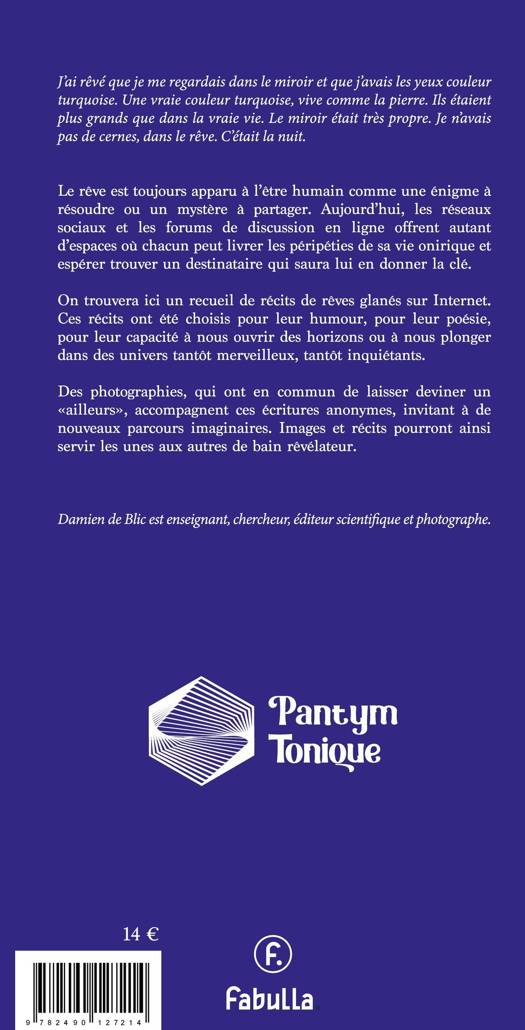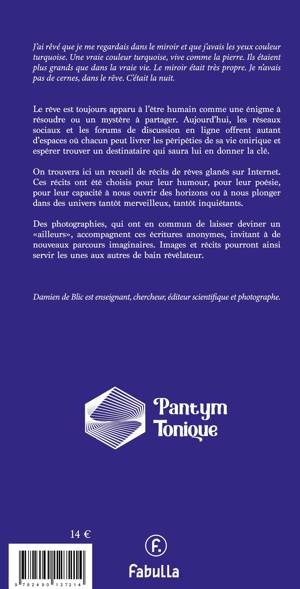 Le rêve est toujours apparu à l’être humain comme une énigme à résoudre ou un mystère à partager. Aujourd’hui, les réseaux sociaux et les forums de discussion en ligne offrent autant d’espaces où chacun peut livrer les péripéties de sa vie onirique et espérer trouver un destinataire qui saura lui en donner la clé. <br /><br /> On trouvera réuni ici un recueil de récits de rêves glanés sur Internet. Ces récits ont été choisis pour leur humour, pour leur poésie, pour leur capacité à nous ouvrir des horizons ou à nous plonger dans des univers tantôt merveilleux, tantôt inquiétants. <br /><br /> Des photographies, qui ont en commun de laisser deviner un « ailleurs », accompagnent ces écritures anonymes, invitant à de nouveaux parcours imaginaires. Images et récits pourront ainsi servir les unes aux autres de bain rêvélateur. <br />