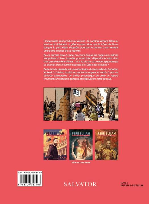 L'adaptation BD d'un roman culte, thriller religieux et prophétique vendu à 250 000 exemplaires dans le monde. L'impensable s'est produit au Vatican : le cardinal Vettore, félon au service du Président, a giflé le pape. Alors que le trône de Pierre tangue, le père Elijah s'apprête pourtant à donner à son ennemi une ultime chance de se repentir. De ce dernier face-à-face, au cours duquel les anges eux-mêmes s'apprêtent à livrer bataille, pourrait bien dépendre le salut d'un très grand nombre d'âmes⦠Et si la clé de ce combat gigantesque se cachait dans l'humble sagesse de l'Église des origines ? Cette bande dessinée est une adaptation du best-seller du Canadien Michael D. O'Brien, traduit en quatorze langues et vendu à plus de 250 000 exemplaires. Un thriller prophétique qui jette un regard troublant sur l'actualité politique et religieuse de notre époque.