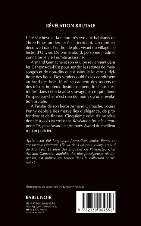 L'été s'achève et la nature réserve aux habitants de Three Pines un dernier éclat terrifiant. Un soi-disant inconnu de tous est retrouvé mort dans le lieu le plus animé du village, le bistro d'Olivier. Armand Gamache et son équipe reviennent dans les Cantons- de-l'Est pour sonder les strates de mensonges et de non-dits que dissimule le vernis idyllique des lieux. Des sentiers oubliés vont les conduire au fond des bois, là où se cachent des secrets et des trésors honteux... "Révélation brutale" a été récompensé par l'Agatha Award et l'Anthony Award du meilleur roman policier.