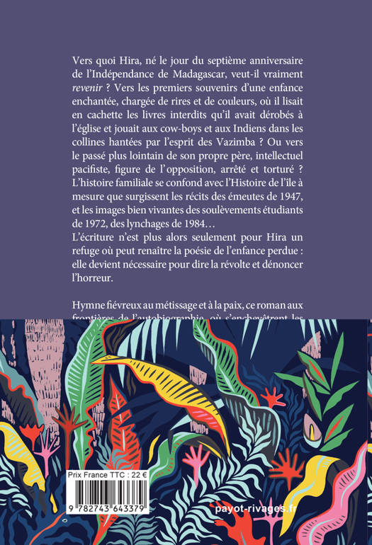 Vers quoi Hira, né le jour du septième anniversaire de l'Indépendance de Madagascar, veut-il vraiment «revenir» ? Vers les premiers souvenirs d'une enfance enchantée, chargée de rires et de couleurs, où il lisait en cachette les livres interdits qu'il avait dérobés à l'église et jouait aux cow-boys et aux Indiens dans les collines hantées par l'esprit des Vazimaba ? Ou vers le passé plus lointain de son propre père, intellectuel pacifiste, figure de l'opposition, arrêté et torturé ? L'histoire familiale se confond avec l'Histoire de l'île à mesure que surgissent les récits des émeutes de 1947, et les images bien vivantes des soulèvements étudiants de 1972, des lynchages de 1984...