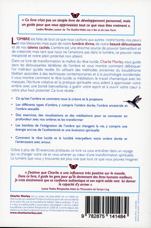 Dans ce livre de transformation, le maître du rêve lucide, Charlie Morley, vous guide dans les éblouissantes ténèbres de l’ombre et vous montre comment débloquer l’or intérieur qu’elle recèle. L’ombre est faite de tout ce que nous cachons aux autres : notre honte, nos peurs et nos blessures, mais aussi de notre lumière divine, de notre beauté éblouissante, et de nos talents cachés. L’ombre est une énorme source de pouvoir bienveillant et de créativité, mais tant que nous ne l’amenons pas dans la lumière, ce pouvoir reste inexploité et notre plein potentiel non atteint. En utilisant des méthodes anciennes du bouddhisme tibétain associées à des techniques contemporaines et à la psychologie occidentale, il vous montre comment le rêve lucide, la méditation, le travail chamanique avec les masques, l’écriture créative et la pratique spirituelle vous aident à apprivoiser votre ombre avec une bonté bienveillante, à guérir votre esprit et à ouvrir votre cœur à votre plus haut potentiel. Ce livre révèle : ce qu’est l’ombre et comment nous la créons et la projetons ; les différents types d’ombre, y compris l’ombre dorée, l’ombre ancestrale et l’ombre sexuelle ; des exercices, des visualisations et des méditations pour se connecter en profondeur avec nos ombres et les transformer ; les bienfaits de l’intégration de l’ombre qui changent la vie, y compris une énergie accrue, de l’authenticité et une évolution spirituelle ; comment le rêve lucide et la lucidité interpellent votre ombre dorée et l’embrassent avec amour. Grâce à plus de 30 exercices pratiques, ce livre va vous entraîner dans un voyage qui va changer votre vie et vous amener au cœur d’une transformation spirituelle. La lumière que vous y trouverez est plus vive que tout ce que vous pouvez imaginer. Après « Rêves d’éveil », continuez votre apprentissage du rêve lucide avec « Rêver jusqu’au bout des ténèbres ».