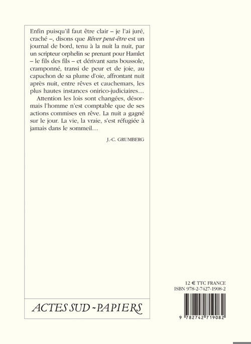 Enfin puisqu'il faut être clair — je l'ai juré, craché —, disons que Rêver peut-être est un journal de bord, tenu à la nuit la nuit, par un scripteur orphelin se prenant pour Hamlet — le fils des fils — et dérivant sans boussole, cramponné, transi de peur et de joie, au capuchon de sa plume d'oie, affrontant nuit après nuit, entre rêves et cauchemars, les plus hautes instances onirico-judiciaires... Attention les lois sont changées, désormais l'homme n'est comptable que de ses actions commises en rêve. La nuit a gagné sur le jour. La vie, la vraie, s'est réfugiée à jamais dans le sommeil...