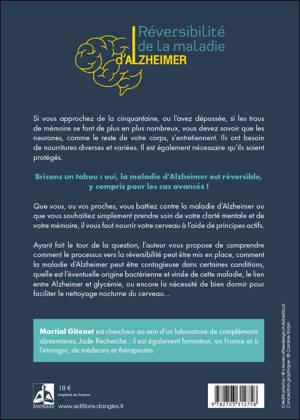 Si vous approchez de la cinquantaine, ou l’avez dépassée, si les trous de mémoire se font de plus en plus nombreux, vous devez savoir que les neurones, comme le reste de votre corps, s’entretiennent. Ils ont besoin de nourritures diverses et variées. Il est également nécessaire qu’ils soient protégés. Brisons un tabou : oui, la maladie d’Alzheimer est réversible, y compris pour les cas avancés ! Que vous, ou vos proches, vous battiez contre la maladie d’Alzheimer ou que vous souhaitiez simplement prendre soin de votre clarté mentale et de votre mémoire, il vous faut nourrir votre cerveau à l’aide de principes actifs. Ayant fait le tour de la question, l’auteur vous propose de comprendre comment le processus vers la réversibilité peut être mis en place, comment la maladie d’Alzheimer peut être contagieuse dans certaines conditions, quelle est l’éventuelle origine bactérienne et virale de cette maladie, le lien entre Alzheimer et glycémie, ou encore la nécessité de bien dormir pour faciliter le nettoyage nocturne du cerveau…