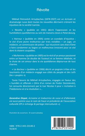 Mikhaïl Petrovitch Artsybachev (1878-1927) est un écrivain et dramaturge russe dont toutes les nouvelles décrivent crûment les injustices de la société tsariste. « Révolte » (publiée en 1901) décrit l’oppression et les humiliations quotidiennes au sein de maisons closes à Petersbourg.« Horreur » (publiée en 1905) conte un scandale d’injustice: le viol d’une jeune institutrice par trois notables - un juge, un médecin, un commissaire de police - qui réussirent sans état d’âme à faire condamner au bagne un malheureux innocent pour ce viol dont ils étaient coupables.« Ma femme » (publiée en 1905) est le récit d’un amour passionné entre un homme (le double de l’auteur) et sa femme idéalisée, et la chute de cet amour dans la vie quotidienne dépourvue de tout charme.« Le docteur » (publiée en 1906) décrit un pogrom à Kiev et les tourments d’un médecin engagé aux côtés du peuple et des Juifs (les « youpins »).Toute l’oeuvre de Mikhaïl Artsybachev, engagée en faveur des « humiliés et offensés » (titre d’un roman de Fiodor Dostoïevski), fut censurée directement par le tsar Nicolas II pour « incitation à l’hédonisme et à la révolution »...