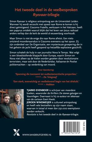 In Revolutie, het razend spannende tweede deel in de succesvolle Ryevaar-reeks van Jeroen Windmeijer en Tjarko Evenboer is Simon Ryevaar, religieus antropoloog aan de Universiteit van Leiden, direct geïntrigeerd als hij wordt verzocht met spoed naar Rome te komen. Giacomo Fratello, werkzaam in het Vaticaan, heeft een papyrus ontdekt waaruit blijkt dat het leven van Jezus radicaal anders verliep dan de kerk de wereld al eeuwenlang voorhoudt.